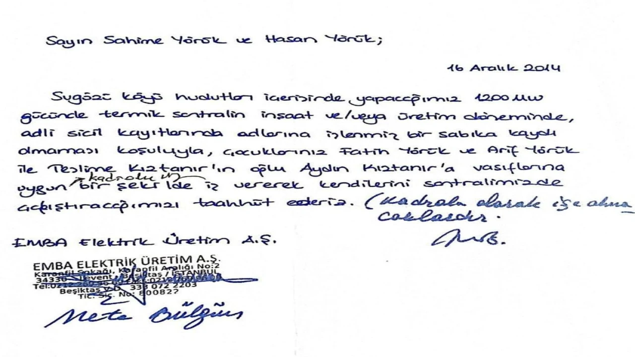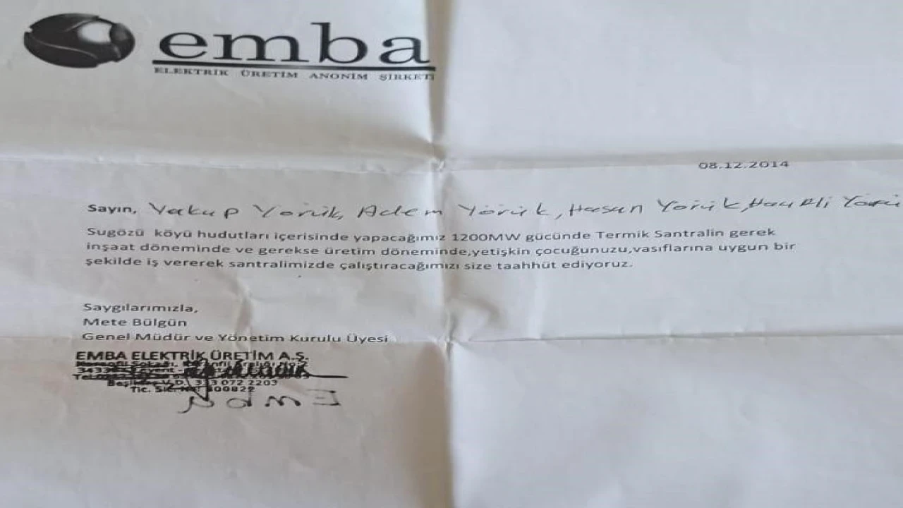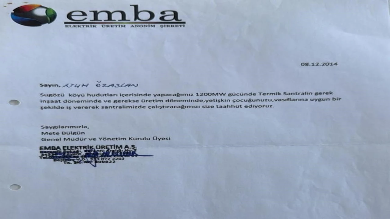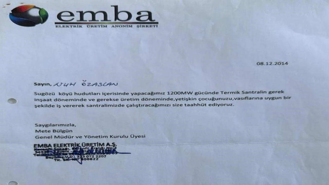 Mahalle sakinlerinin iddiasına göre, EMBA Elektrik Üretim A.Ş. yetkilileri, arazilerin satışı karşılığında vatandaşlara, "Sugözü köyü hudutları içerisinde yapacağımız 1200 MW gücünde termik santralin gerek inşaat döneminde ve gerekse üretim döneminde, yetişkin çocuğunuzu, vasıflarına uygun bir şekilde iş vererek santralimizde çalıştıracağımızı size taahhüt ediyoruz" yazılı genel müdür imzalı taahhütname imzaladı. Ancak bölge sakinleri, bu sözün tutulmadığını ileri sürdü.