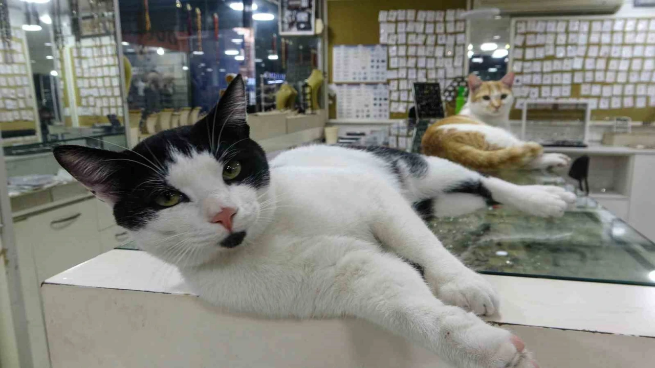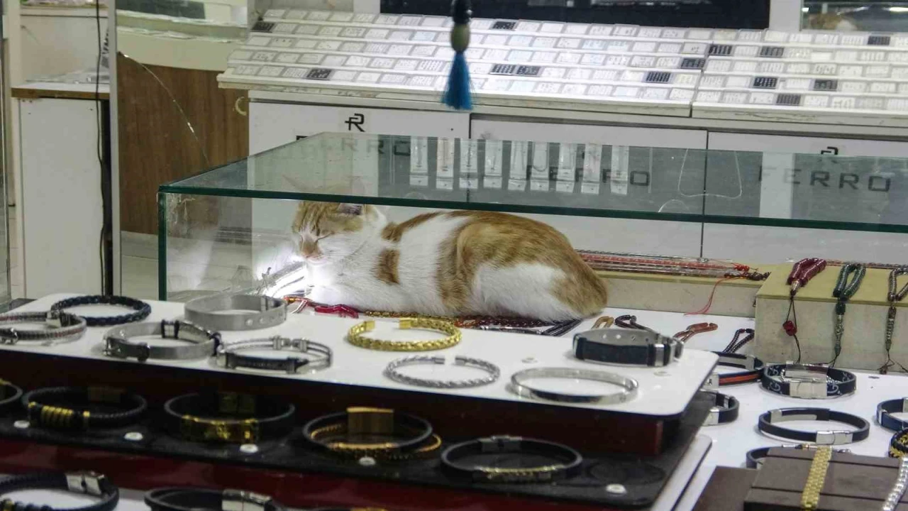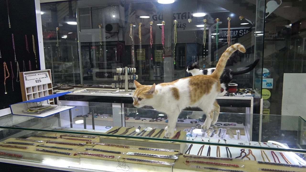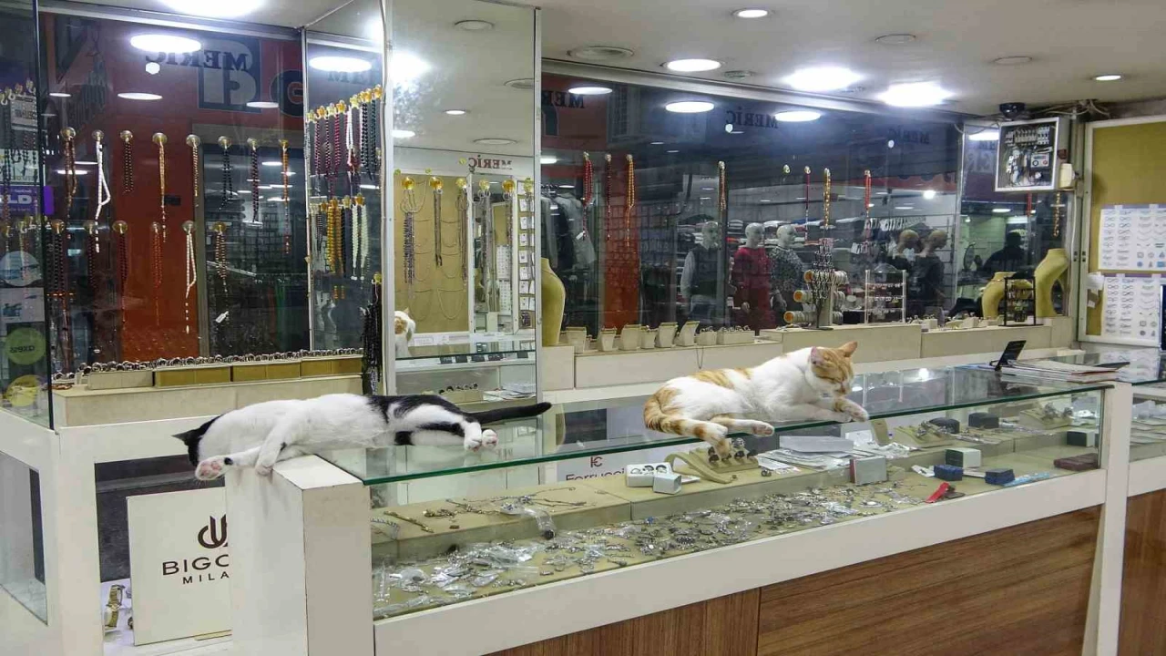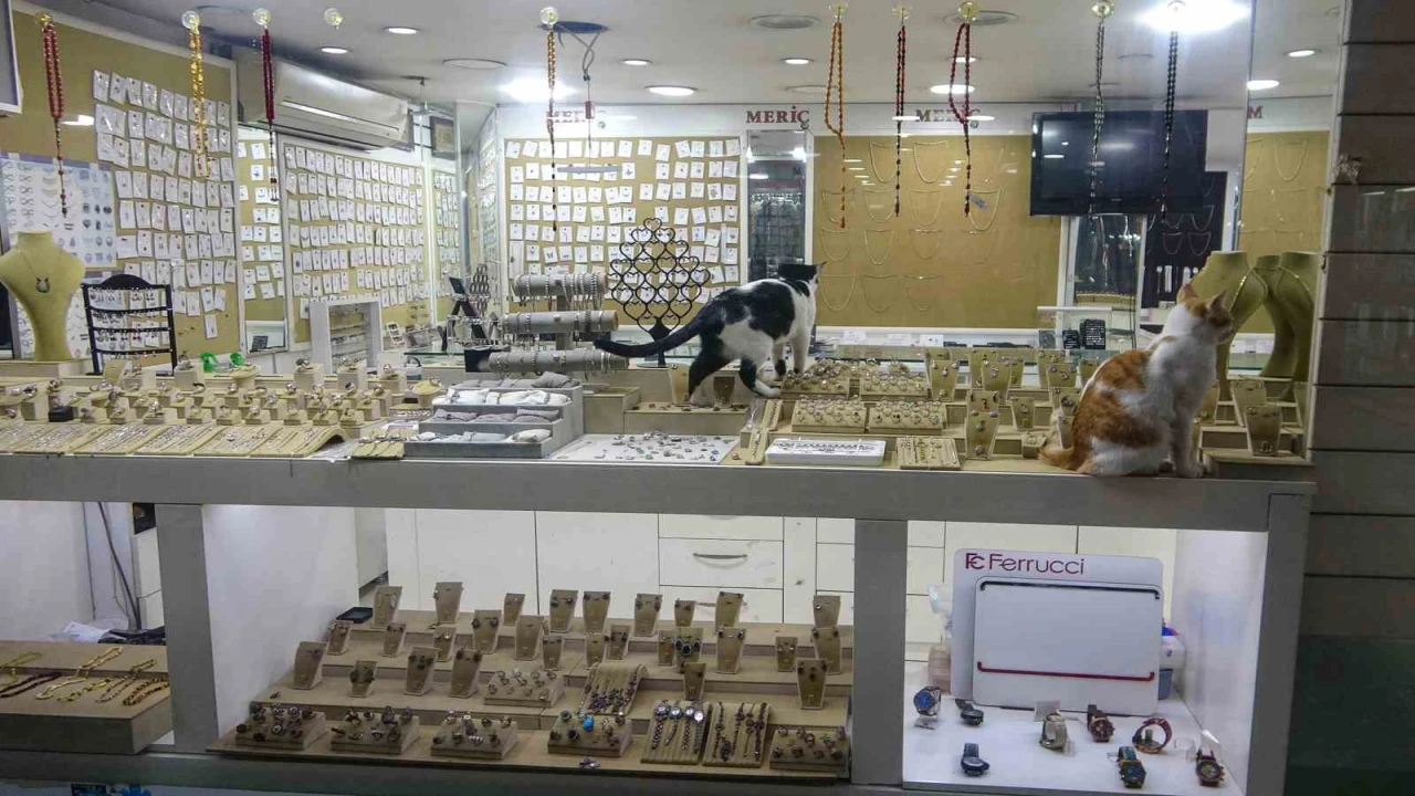 Mersin’de bir esnafın iş yerinde beslediği kediler, gümüş takı tasarım dükkanının vitrinini süslüyor. Her sabah iş yerini açmaya geldiğinde ortalığın dağınık olduğunu belirten Adem İnan, "Sabah gelip dükkanı açtığımda her gün aynı manzarayla karşılaşıyorum; vitrinler dağılmış. Gece olunca burası onların yaşam alanı gibi oluyor, vitrine çıkıp oynuyorlar" dedi.