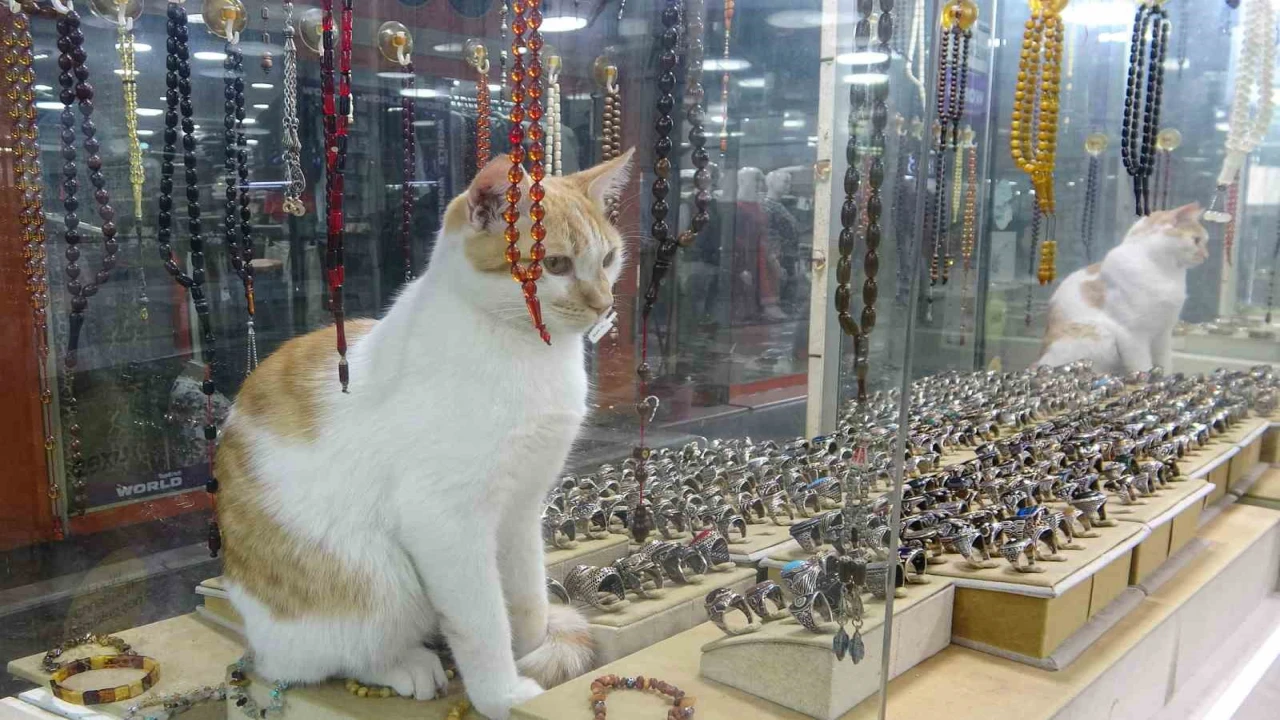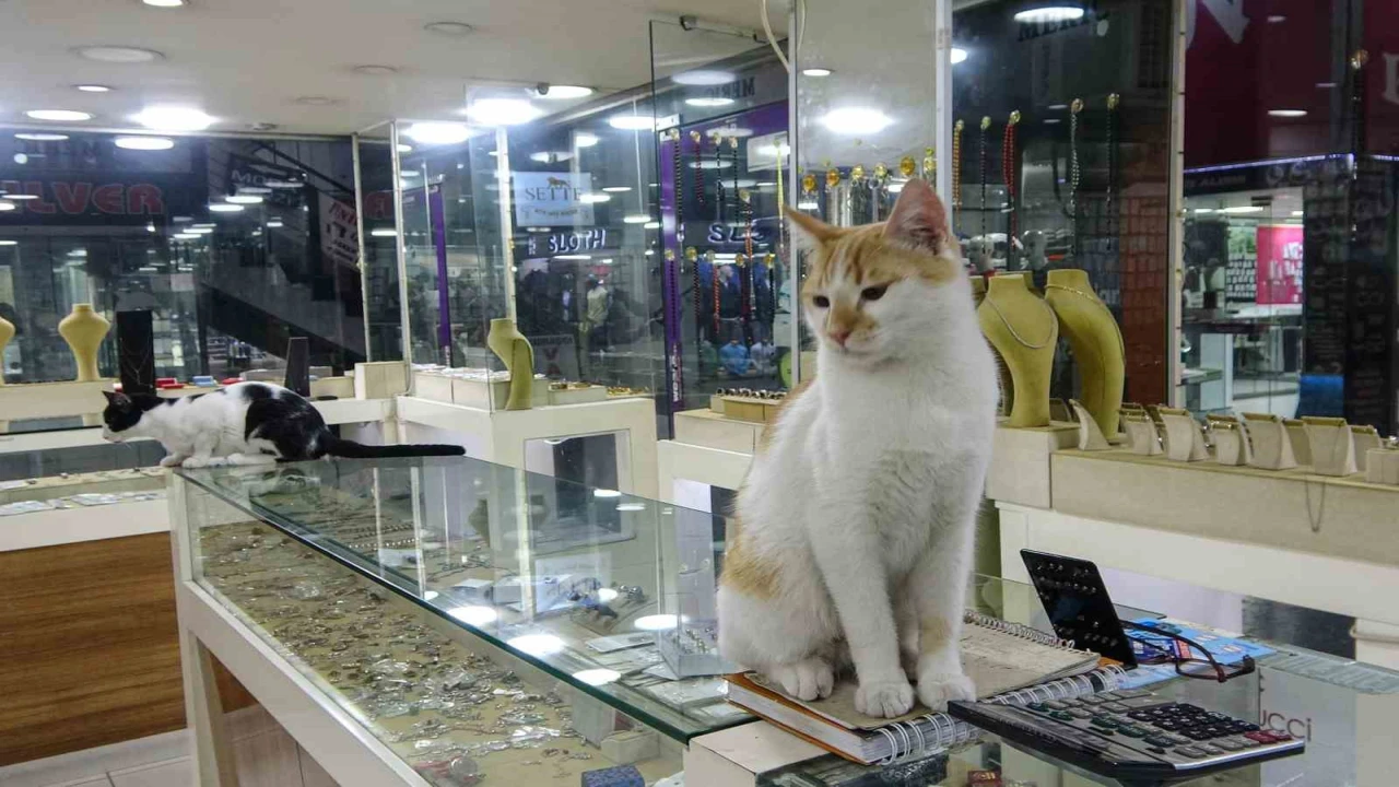 Mersin Çarşısı’nda 25 yıllık esnaf Adem İnan’ın işlettiği gümüş takı tasarım dükkanında vitrini gümüş takıların yanı sıra aralarında gezen kediler de de süslüyor. İnan iş yerinde beslediği kediler vitrinde de gezerek müşterilerin ilgisini çekiyor. ’Prens’ adlı sarman cinsi kedi ile ’Gümüş’ adlı smokin cinsi kedi gün boyu vitrinlerde dolaşarak, müşterilere neşe katıyor.