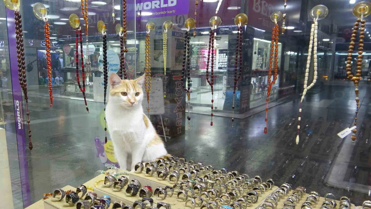 MERSİN'DE BİR ESNAFIN İŞ YERİNDE BESLEDİĞİ KEDİLER, GÜMÜŞ TAKI TASARIM DÜKKANININ VİTRİNİNDE SERBESTÇE DOLAŞARAK MÜŞTERİLERİN İLGİSİNİ ÇEKİYOR.