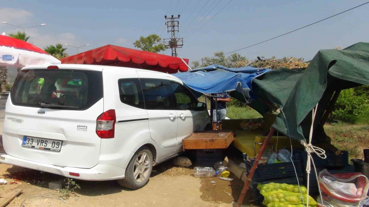 Mersin’in Silifke ilçesinde yol kenarında duran araca arkadan çarpan sürücü otomobilini bırakıp kaçtı. Kazaya karışan araçlardan biri çilek ve incir gibi yöresel ürünler satılan tezgaha girdi.