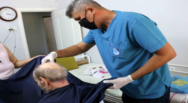 Yunusemre Belediyesi, evde destek hizmeti kapsamında ilçede yaşayan hasta, yaşlı, engelli ve yatağa bağlı vatandaşlara berber hizmet vermeye devam ediyor.