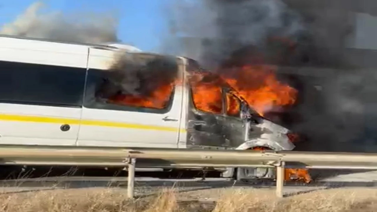 ADANA'DA ÖĞRENCİ SERVİSİ ALEVLERE TESLİM OLDU. ÖĞRENCİLER SERVİSTEN TAHLİYE EDİLDİ.