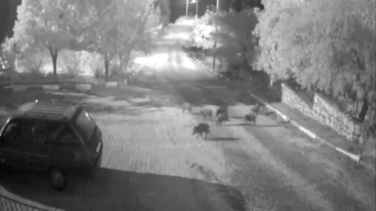 Gece saat 01.30 sıralarında mahalle arasında dolaşan domuz sürüsü, güvenlik kameralarına yansıdı. Görüntülerde domuzların uzun süre mahalle içinde dolaşıp yiyecek aradıkları, daha sonra ormanlık alana doğru uzaklaştıkları görüldü.