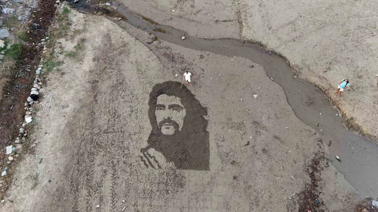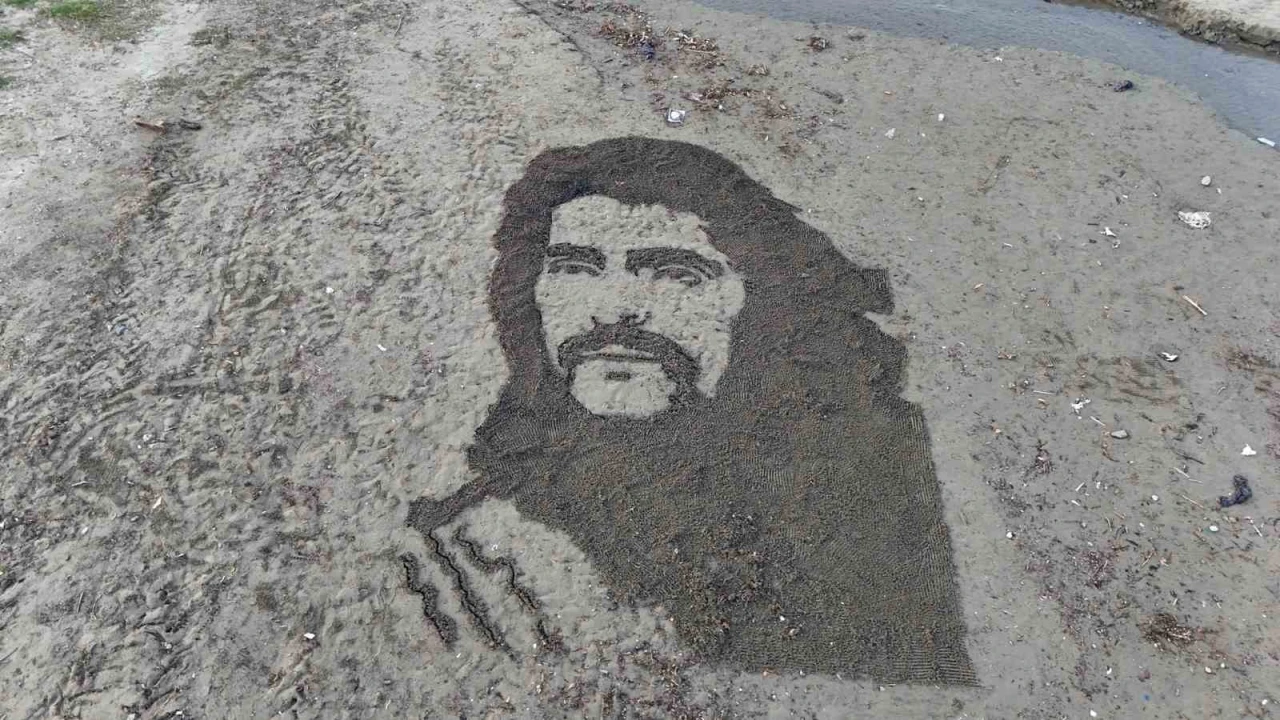 ALANYA'DA YAŞAYAN İRANLI SANATÇI FARAJOLLAH BAGHERİ, TÜRK MÜZİĞİNİN EFSANE İSMİ BARIŞ MANÇO'NUN DEV PORTRESİNİ GALİP DERE PLAJI'NIN KUMLARINA RESMETTİ.
