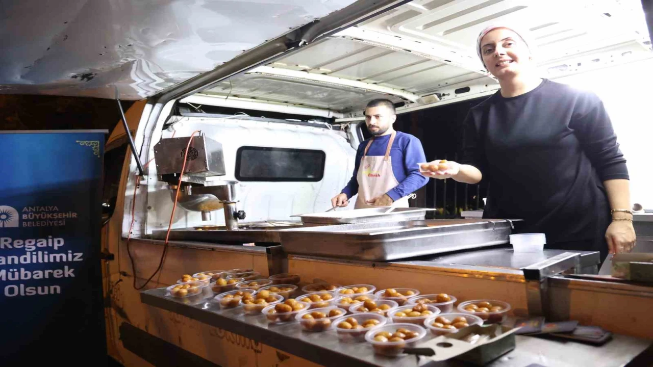 Antalya Büyükşehir Belediyesi, Regaip Kandili dolayısıyla 19 ilçede vatandaşlara lokma ve kandil simidi ikramında bulundu. Kepez ve Muratpaşa’da kurulan mobil stantlarda toplam 5 bin kişilik sıcak lokma dökülürken, ilçelere gönderilen 10 bin kişilik kandil simidi vatandaşlara dağıtıldı.