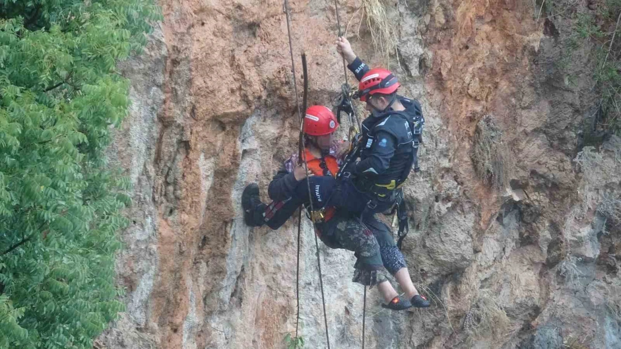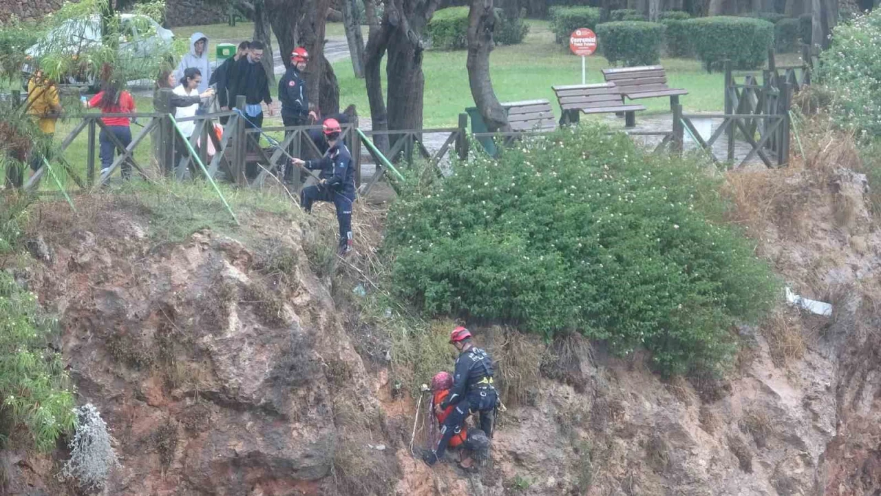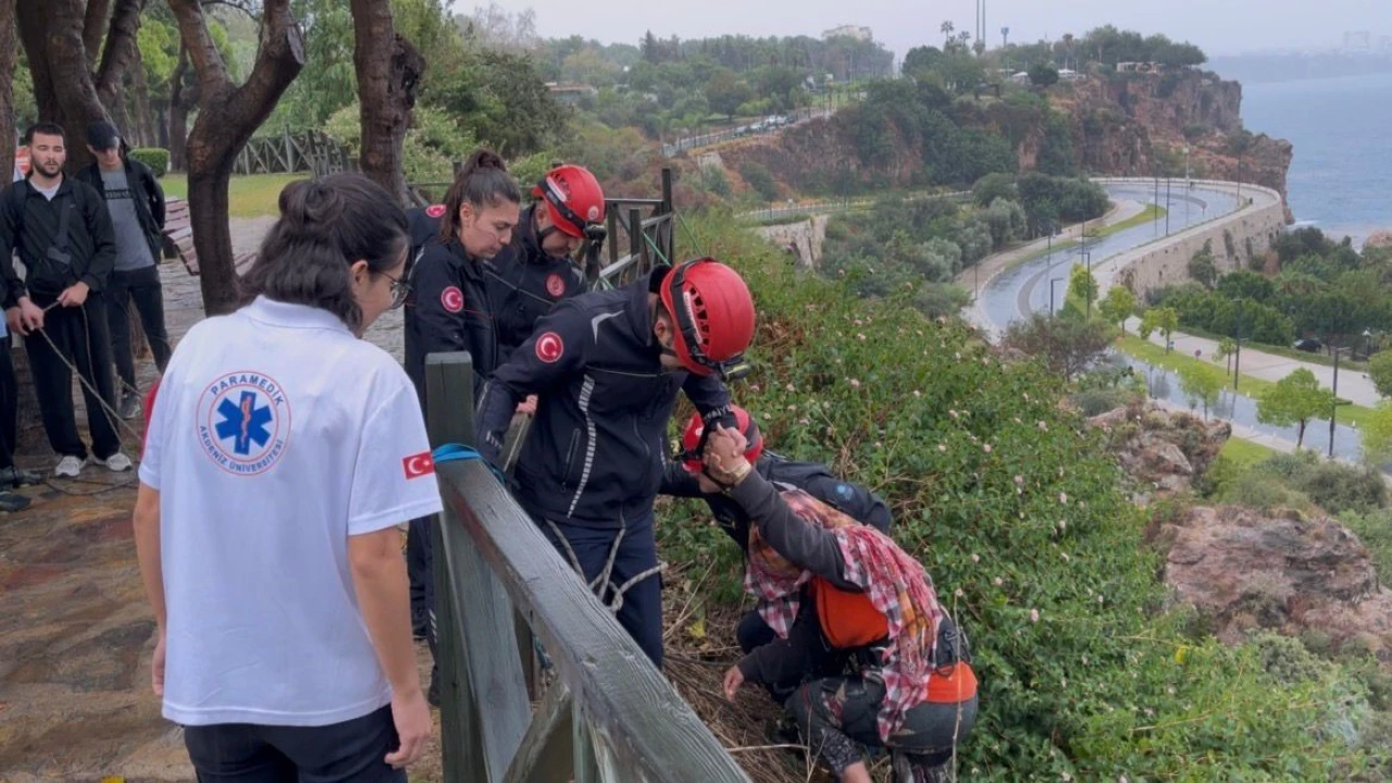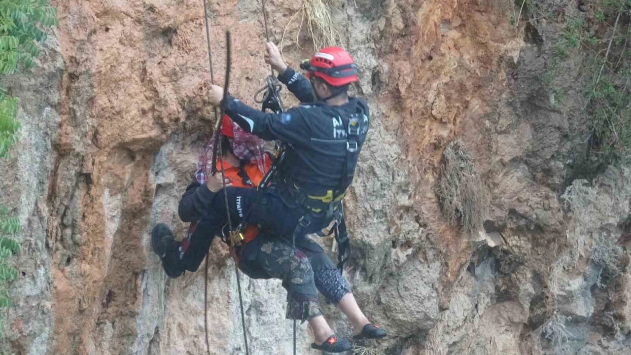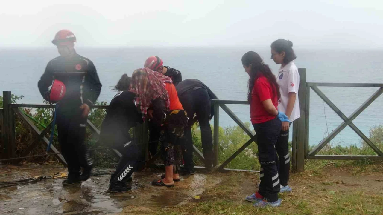 Antalya’da indiği falezlerden yağış nedeniyle geri çıkamayan kadın mahsur kaldı. İtfaiye ekipleri tarafından halat yardımıyla yukarı çekilen kadın kurtarıldı.