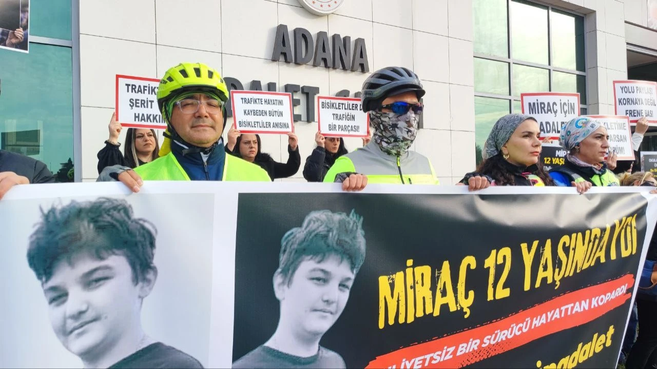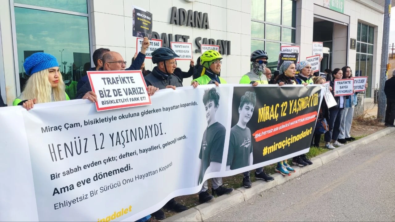 Adana’da 12 yaşındaki bisikletli çocuğun ölümüne neden olan, daha önce ehliyetine el konulduğu öğrenilen sürücüyle ilgili ilk duruşma yapıldı. Avukat duruşmada bilirkişi raporuna itiraz ederken, bisikletli gruplar da Miraç için adliye önünde toplanıp adalet istedi