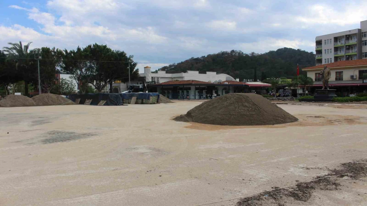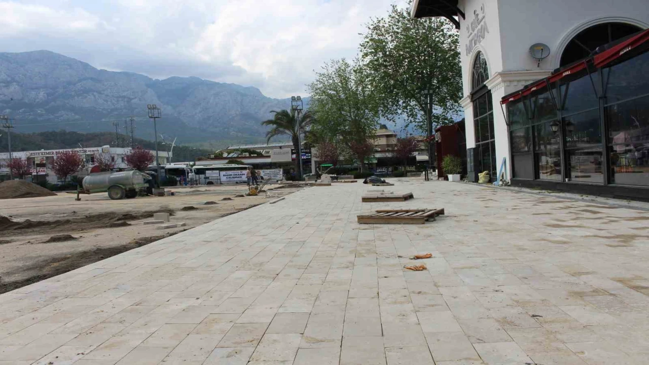 Antalya Büyükşehir Belediyesi ve Kemer Belediyesi işbirliği ile Kemer Cumhuriyet Meydanı turizm sezonuna hazırlanıyor. Meydanın araç giriş çıkışı nedeniyle yıpranan traverten taş kaplamaları değiştiriliyor.