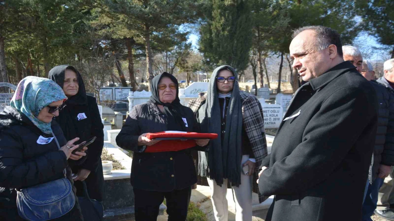 Defin sonrası Korkuteli Kaymakamı Sezgin Üçüncü, Şarlak’ın naaşı üzerindeki Türk bayrağı eşi Havva Şarlak’a teslim etti.