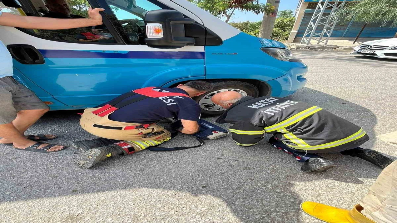 HATAY (İHA) - Hatay'ın Samandağ ilçesinde minibüsün altında sıkışıp mahsur kalan köpek, itfaiye ekipleri tarafından kurtarıldı.