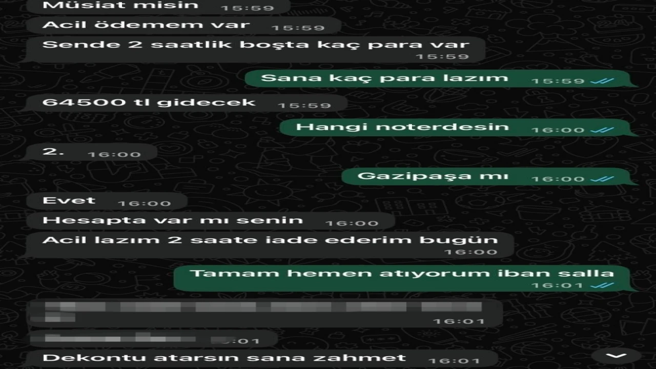 ANTALYA’NIN GAZİPAŞA İLÇESİNDE TELEFON HATTININ KOPYALANDIĞINI İDDİA EDEN BİR VATANDAŞ DOLANDIRICILIK OLAYININ MAĞDURU OLDU. KENDİ ADINA AÇILAN WHATSAPP HESABI ÜZERİNDEN ARKADAŞLARINDAN PARA İSTENDİĞİNİ BELİRTEN SEZER SARI, "BENİM CANIM YANDI, BAŞKASININ YANMASIN" DİYEREK VATANDAŞLARI DİKKATLİ OLMAYA ÇAĞIRDI.