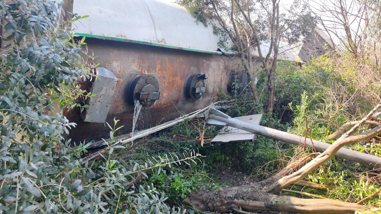 Hatay’da dönüş yaptığı esnada devrilen tankerin portakal bahçesine uçtuğu anlar araç kamerasına yansıdı.