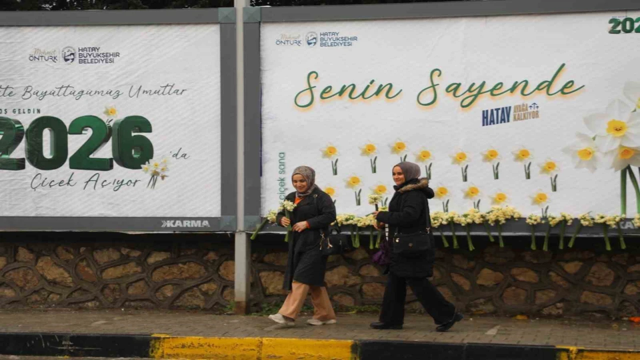 HBB ekipleri, şehrin faklı noktalarındaki billboardlarda HBB Başkanı Mehmet Öntürk'ün, "Birlikte Büyüttüğümüz Umutlar 2026'da Çiçek Açıyor" yazılı tebrik mesajlarının olduğu görsellerin üzerine Hataylı vatandaşlara yılbaşı hediyesi olarak demet demet nergis çiçekleri yerleştirdi.